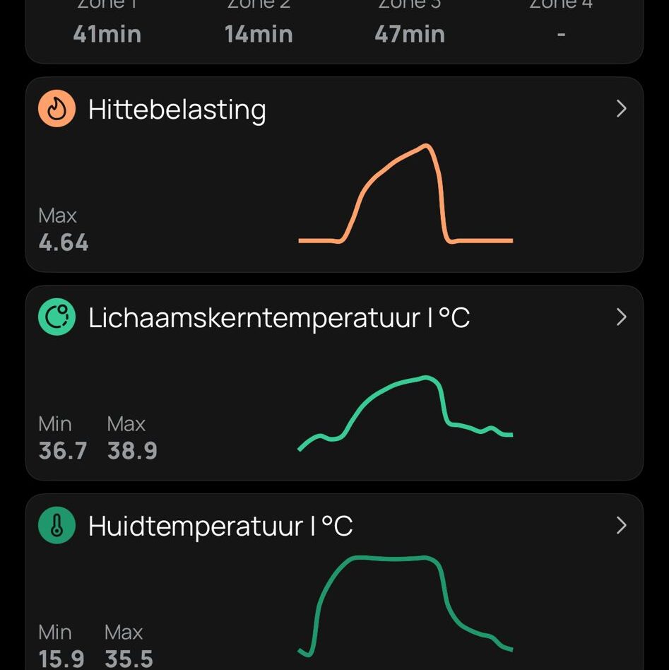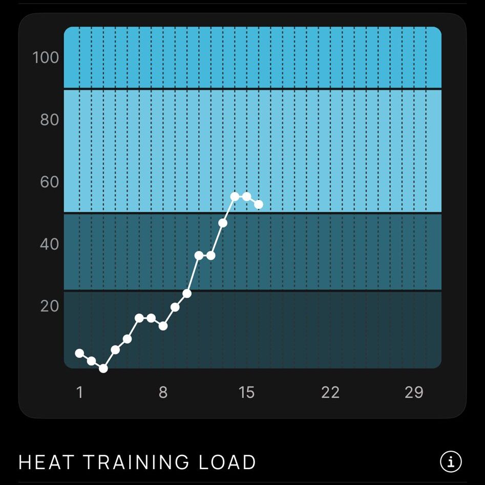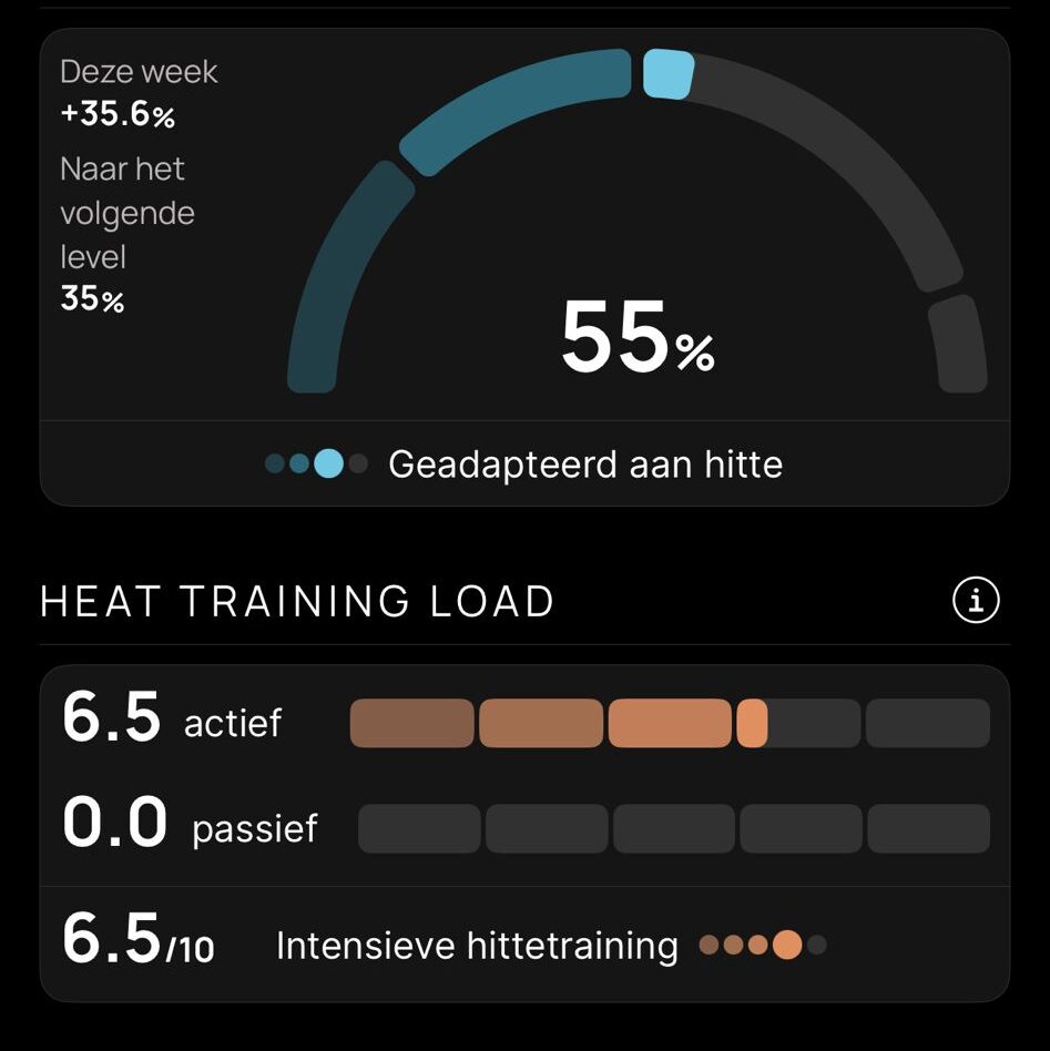 In the app, you can see how much time you spend at a specific HSI. The HSI scores are set into zones, with HSI 0-1 as zone 1, HSI 1-3 as zone 2, HSI 3-7 as zone 3, and HSI 7-10 as zone 4. The sweet spot for heat training lies at zone 3. Extended periods at zone 2 (multiple hours) also provide a heat benefit, but this is an inefficient way to provide a stimulus. Zone 4, which I personally never reached while measuring, would be considered dangerously hot. It is best to not train untill the point where your body reaches those temperatures. For a normal heat session you should aim for about 30-40 minutes in zone 3, up to maximum 60 minutes if you are well-adapted. It takes some time to get warm enough, resulting in most heat trainings lasting between 60 and 90 minutes. The time spent at certain heat zones correlates with the heat training score, a number between 0 and 10 that tells you how impactful the heat session as a whole was. For higher heat training scores, your heat adaptation score, a percentage between 0 and 100, increases more. If you take time off from heat training, your heat adaptation score decreases again.